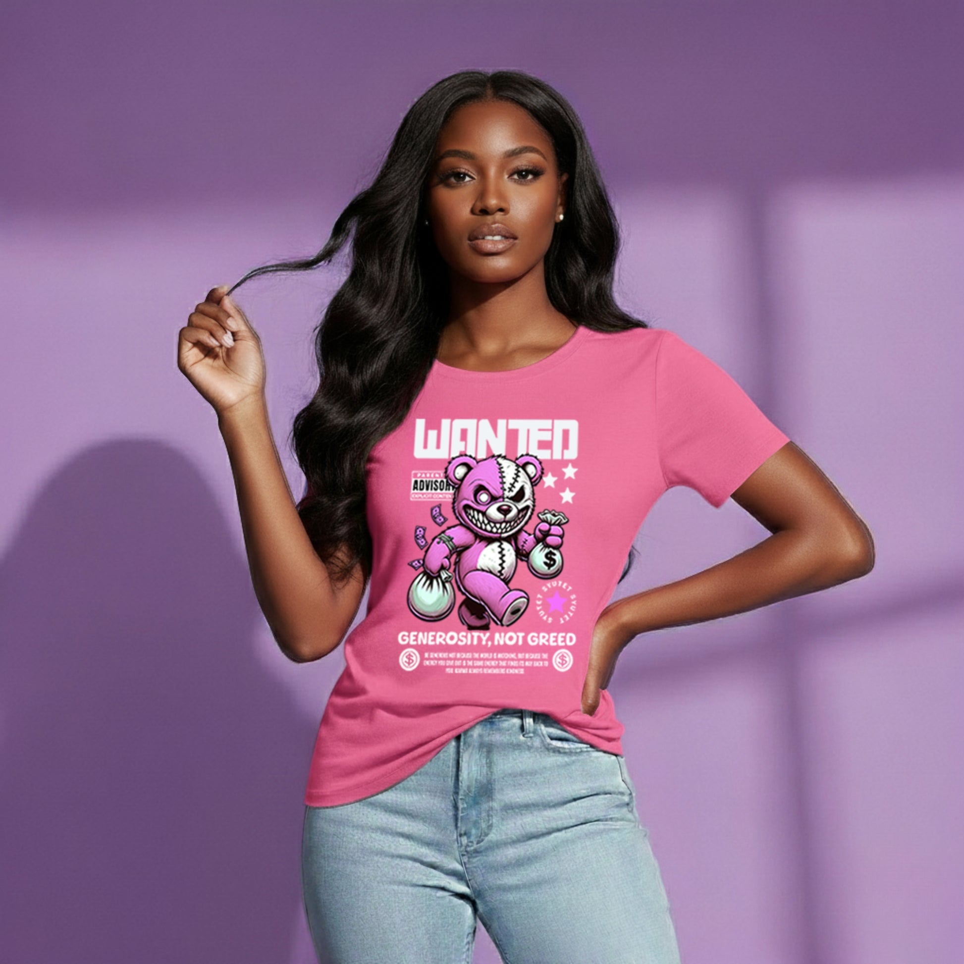Lernen Sie unser Wanted Bear T-Shirt im Design Pink kennen, wo Stil auf Zweckmäßigkeit trifft und jedes Design eine wichtige Botschaft vermittelt: „ Gesucht: Großzügigkeit, nicht Gier.“