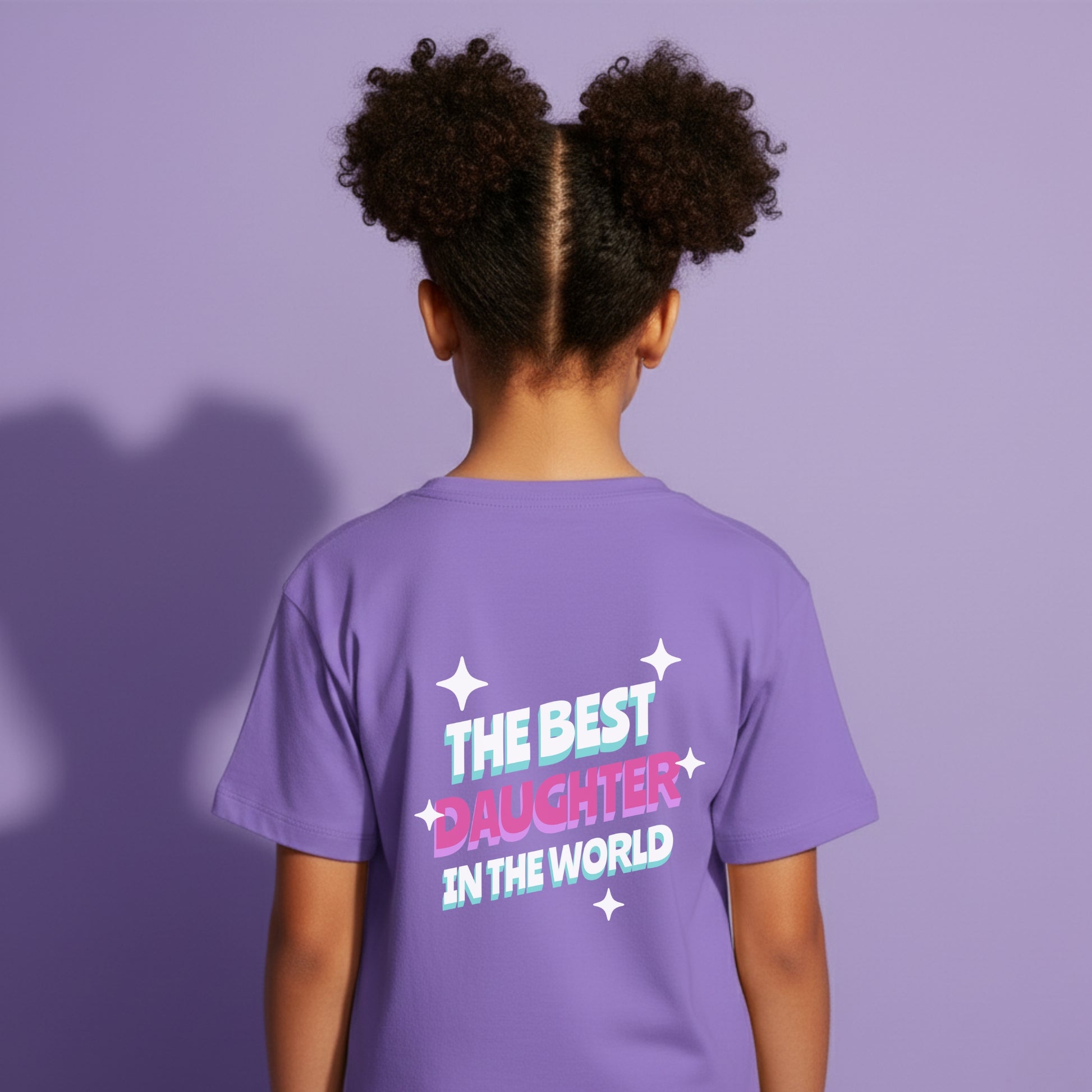 Celebra la gioia e l'energia di essere la figlia migliore con una maglietta vivace e piena di vita come la tua piccola! Realizzata pensando alla positività, questa maglietta è pensata per stare al passo con lo stile di vita attivo della tua bambina, irradiando vibrazioni positive per tutto il giorno. Che stiano studiando a pieni voti o giocando con gli amici, questa maglietta offre il perfetto mix di comfort e libertà.