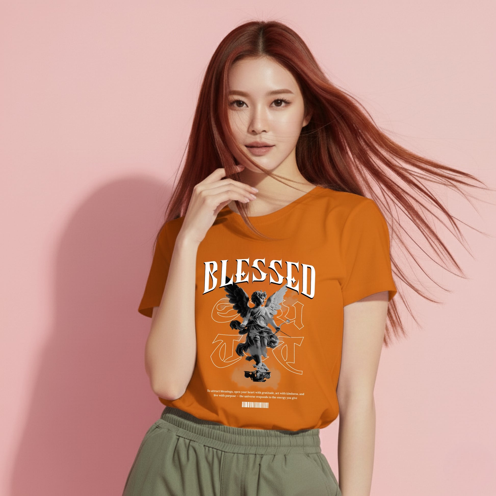 Wear your gratitude with purpose. Our Orange-Yellow Colors Blessed T-Shirt features the inspiring quote: “To attract blessings, open your heart with gratitude, act with kindness, and live with purpose — the universe responds to the energy you give.”